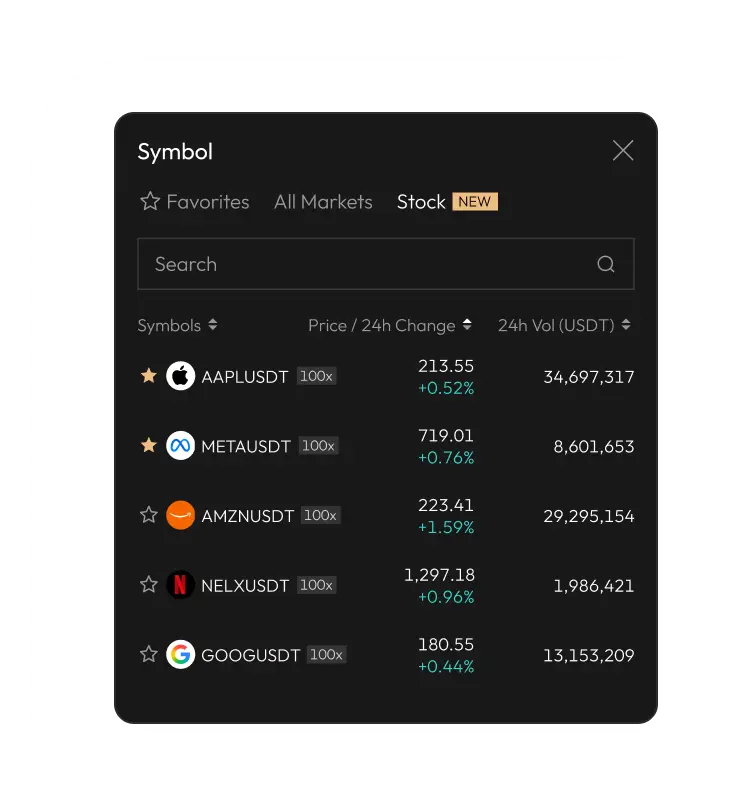 stock with up to 100x leverage. Fully settled in crypto, no bridging required.
